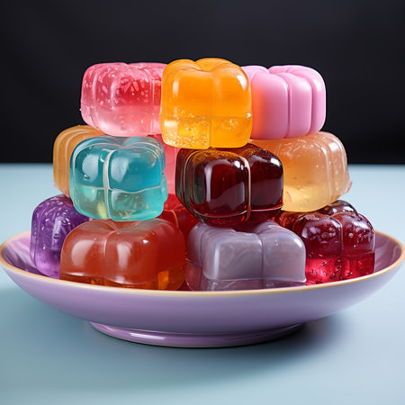 A vibrant assortment of colorful gelatin candy arranged on a plate, set against a bright background, perfect for parties and cheerful gatherings.