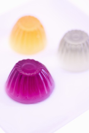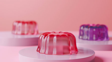A delightful arrangement of three colorful, translucent jellies presented on round pedestals against a soft pink background.