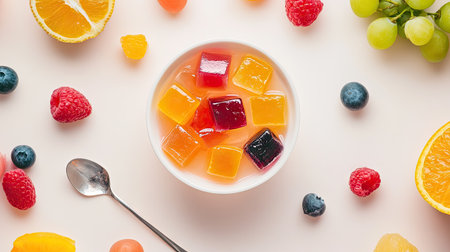A flat lay of a bowl of fruity jelly cubes, surrounded by fresh fruits and a spoon on a light-colored table