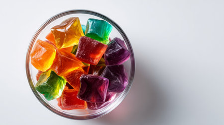 A high-angle shot of an assortment of jelly cubes in various bright colors, arranged neatly on a white plate, showcasing their glossy texture and appeal.