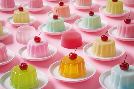 Colorful jelly desserts with cherries on a pastel pink background, showcasing a variety of textures and vibrant hues perfect for summer celebrations or sweet events