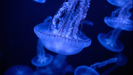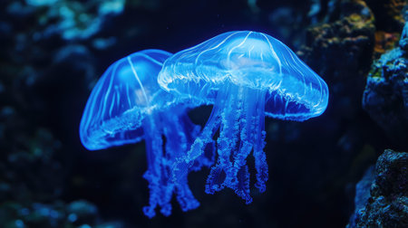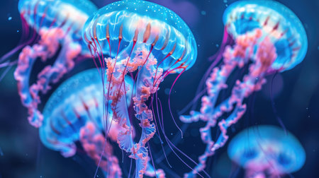 Beautiful medusas with translucent bodies illuminated by blue neon light, floating gracefully in a dark aquarium setting