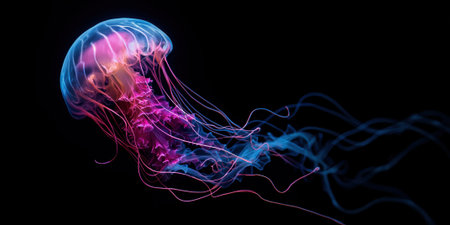 a jellyfish swimming in black water, neon bioluminescent glow of pink and blue colors. Panoramic banner