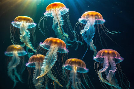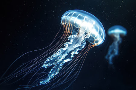Luminous jellyfish with long tentacles floating in dark water, creating a mesmerizing underwater scene