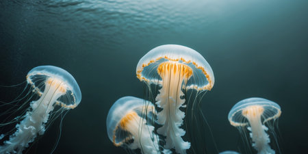 A group of jellyfish swimming gracefully in the ocean, their transparent bodies glowing in the water