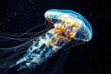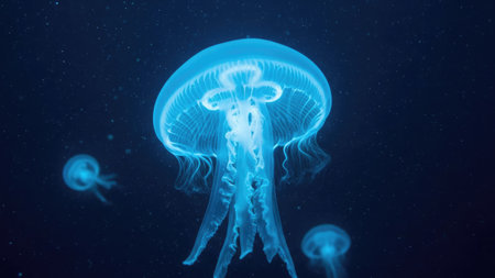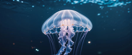 Vibrant aquatic sea jelly with glowing tentacles in blue ocean water