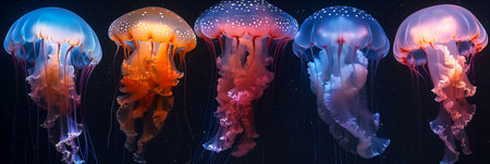 Group of rare colored jellyfish close-up, dark background. AI generated. Marine ocean fauna, wildlife. Header banner mockup with copy space.
