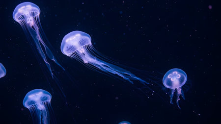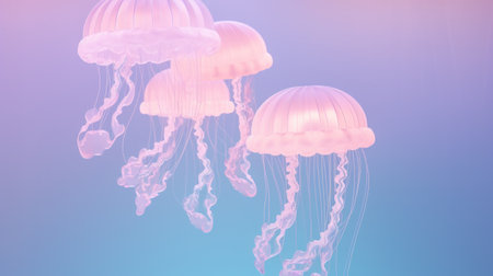 Glowing jellyfish with translucent bodies in soft neon light