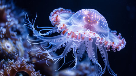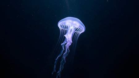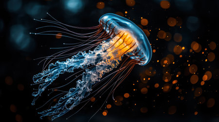 A jellyfish glides fluidly through the dark depths of the ocean, its luminous tentacles trailing behind. The creature's bell, adorned with white spots, radiates an ethereal glow, creating a captivating underwater display.