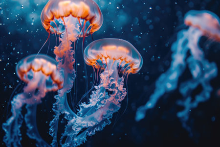 This image presents several jellyfish, illuminated with a blue glow, against a deep, dark backdrop. The aquatic scene showcases the jellyfish with their translucent bodies. The lighting accentuates their form. This image could be suitable for educational materials, website backgrounds, or creative projects that require aquatic themes.