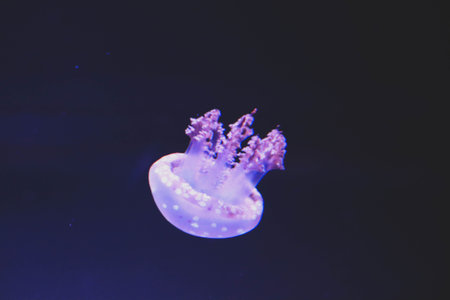 Marble jellyfish, Lychnorhiza lucerna jellyfish drifting gracefully in deep blue water of aquarium. Animal, aquatic organism, underwater life, biodiversity
