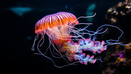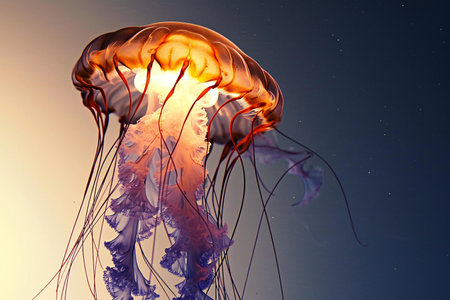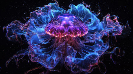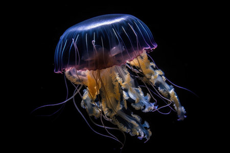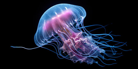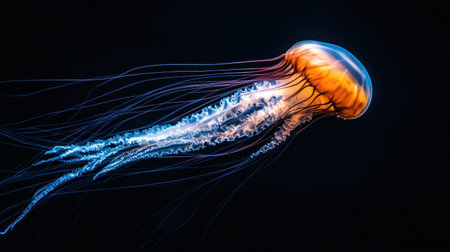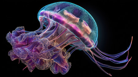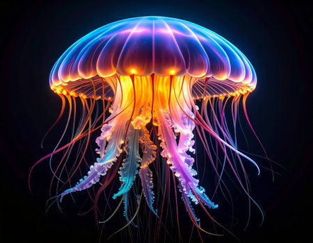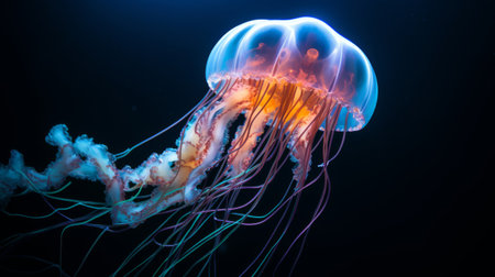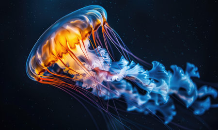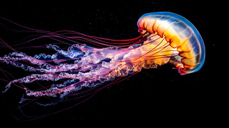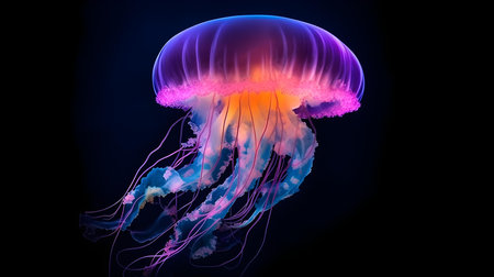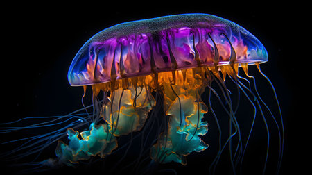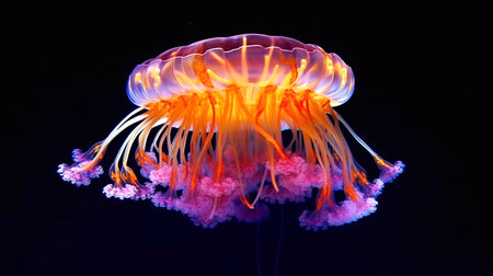 A striking illustration depicts a jellyfish, highlighted against a stark black backdrop. The image features a diverse color palette, with hues of blue, purple, and orange suggesting a bioluminescent effect. The composition focuses on the marine creature, potentially suitable for educational materials or artistic designs.