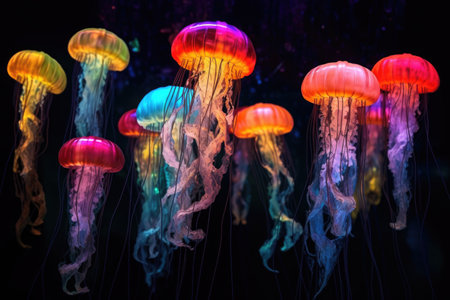 colorful jellyfish group moving in sync underwater, created with generative ai