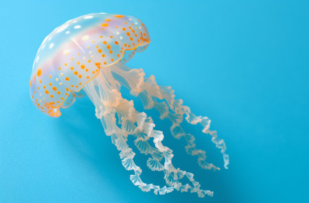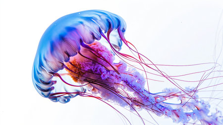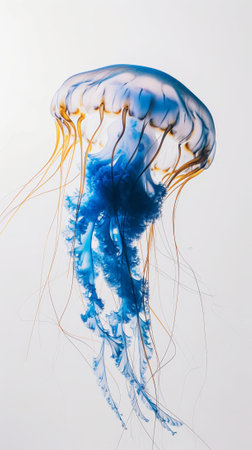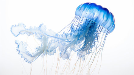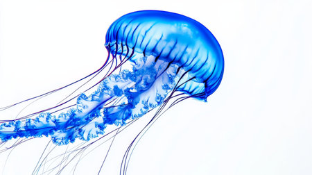 Vibrant blue jellyfish floating against a white background. Marine life and tranquility concept