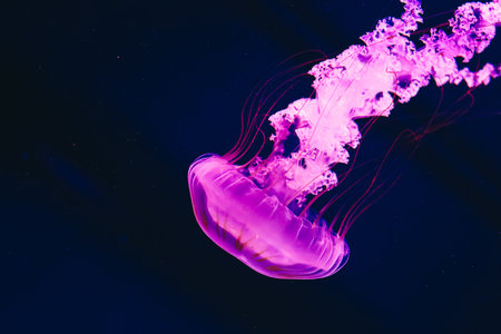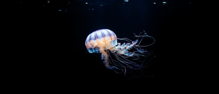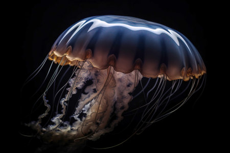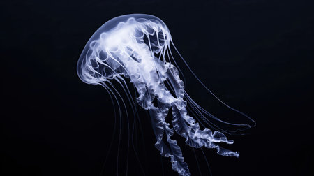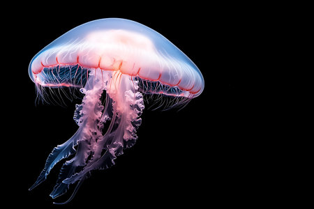 A stunning jellyfish floats gracefully through dark waters, showcasing its translucent body and delicate tentacles. This mesmerizing aquatic creature captivates with its luminous colors and serene movement.