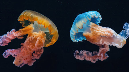 Group of rare colored jellyfish close-up, dark background. AI generated. Marine ocean fauna, wildlife.
