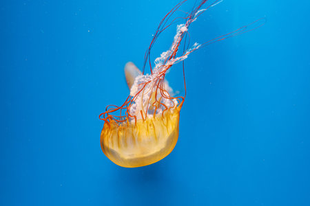 Red jellyfish dancing in the blue ocean water, compass jellyfish, wildlife