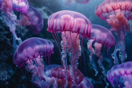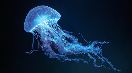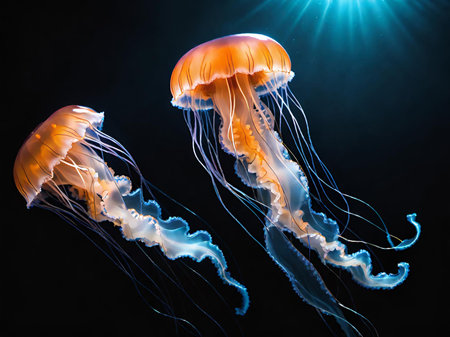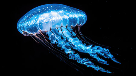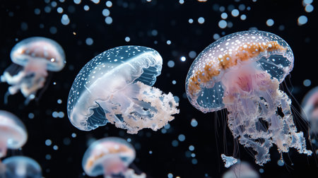 Bioluminescent jellyfish swim elegantly in the dark ocean, creating a stunning visual effect