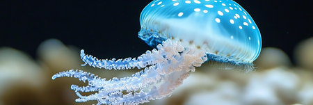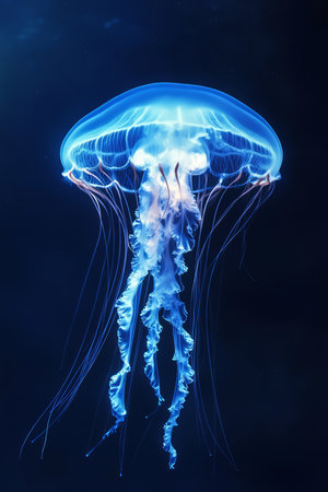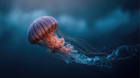 A stunning underwater scene featuring a graceful jellyfish drifting through the deep blue ocean, its translucent tentacles glowing softly in the dim light.