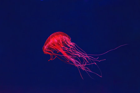 Fluorescent jellyfish swimming underwater aquarium pool with red neon light. The Japanese sea nettle chrysaora pacifica in blue water, ocean. Theriology, biodiversity, undersea life, aquatic organism