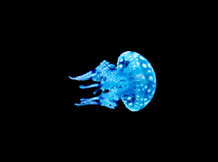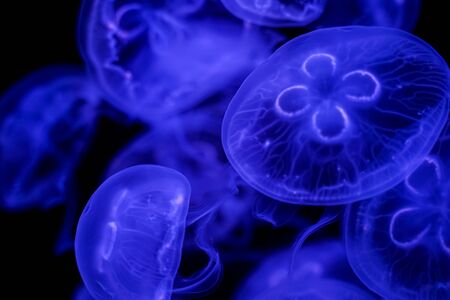 Blue jellyfish isolated on black background. Jellyfish in the water.