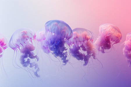 A group of jellyfish are floating in the air, with some of them being pink and purple. The scene is serene and peaceful, with the jellyfish appearing to be floating effortlessly through the air