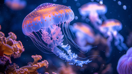 Capture the ethereal beauty of the underwater world. bright glowing jellyfish and fish gracefully glide through the water.