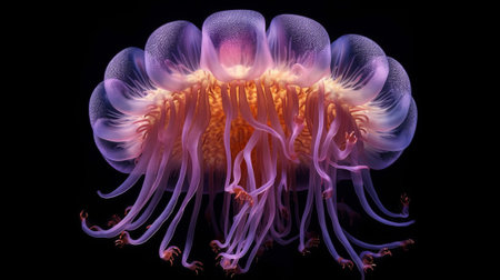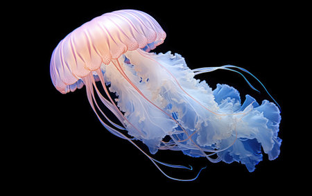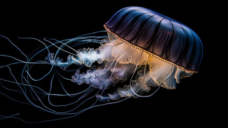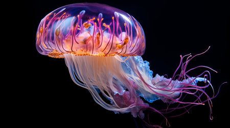 Closeup of jellyfish with its ethereal grace and enchanting color gradients that adorn its translucent body floating on dark background
