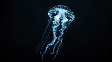 deep-sea jellyfish drifting in the dark, with their bioluminescent tentacles visible, created with generative ai