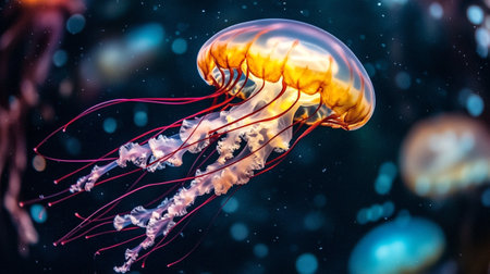 Closeup of jellyfish with its ethereal grace and enchanting color gradients that adorn its translucent body floating on dark background