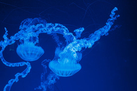 Group of fluorescent jellyfish swim underwater in aquarium pool with blue neon light. The Atlantic sea nettle chrysaora quinquecirha in blue water, ocean. Theriology, tourism, diving, undersea life.