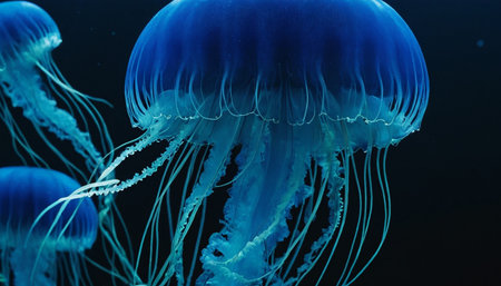 Bioluminescent jellyfish swimming in deep blue water