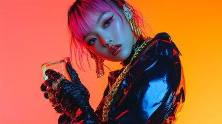 Young woman with pink hair poses elegantly against a vibrant orange and yellow gradient background while holding a glass object