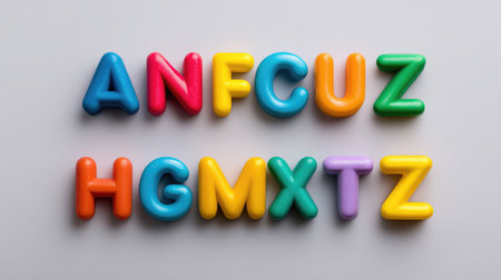 Bright and colorful plastic letters displayed in a random arrangement on a light gray background. Ideal for educational resources, creative projects, and children's activities.