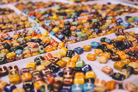 Trays of colorful beads with letters at a craft market.