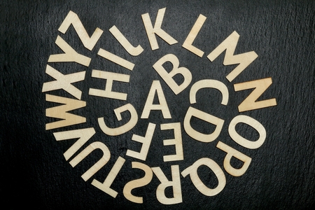 English alphabet letters on wood table.