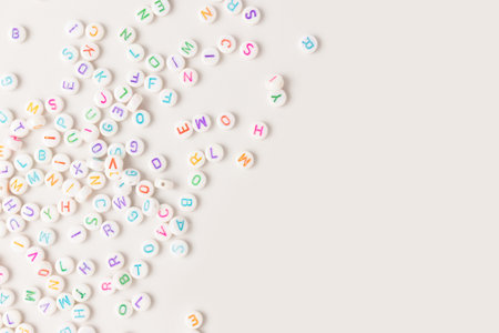 Beads with letters scattered on a beige background. Place for your design.