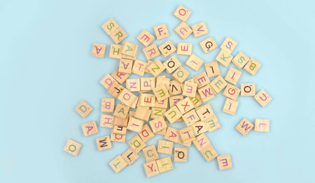 Square wooden tiles with the English alphabet scattered with space for text