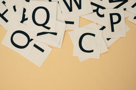 Scattered black alphabet letters on beige surface with randomized flat layout creating a minimalist abstract design