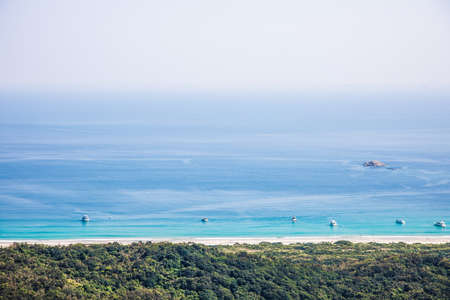 Aerial view of an island and around it boats with sunset in the spring, Jijel, Mediterranean sea, spending a summer vacation in Mediterranean, traveling to algeria afric, Blue sea and orange sky.
