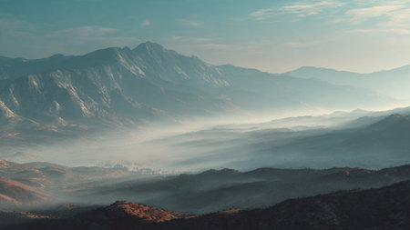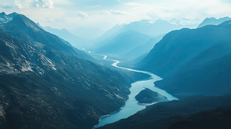 Bird's-eye view of a mountain range with a river winding through, ample space in the sky for text
