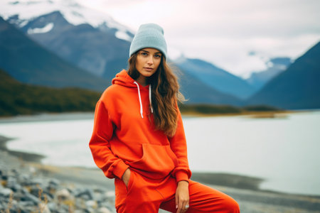 Young woman wearing a vibrant retro-style windbreaker with pastel colors, posing confidently against a warm orange gradient backdrop.