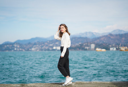 Beautiful girl on walk by sea. Young woman wearing casual clothes sneakers, jeans, blouse standing near water. Seascape with mountains. Walk on concrete embankment