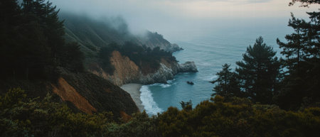 Coastal redwood forest meets dramatic ocean cliffs shrouded in mist and fog