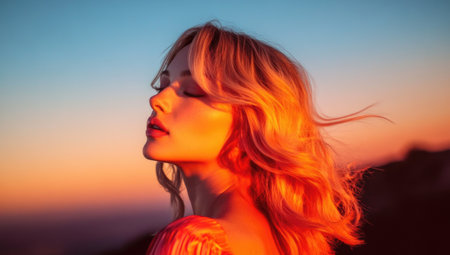 A woman with curly hair is enjoying the sunset on a beach, with her eyes closed and face tilted towards the sky.