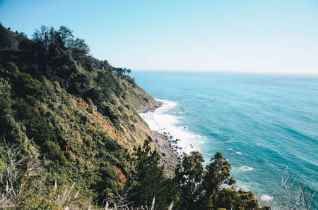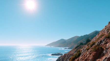 Captivating coastal view featuring bright sunlight illuminating the ocean and rocky mountains under a clear blue sky. A perfect escape into nature's beauty.