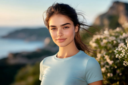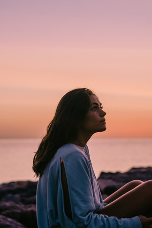 Portrait of a beautiful young woman enjoying the sunset on a hill overlooking the sea