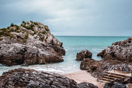A breathtaking view of a rugged and wild coastline, where dark ocean water swirls around massive grey rocks under a dramatic, cloudy sky. A powerful and scenic natural landscape.