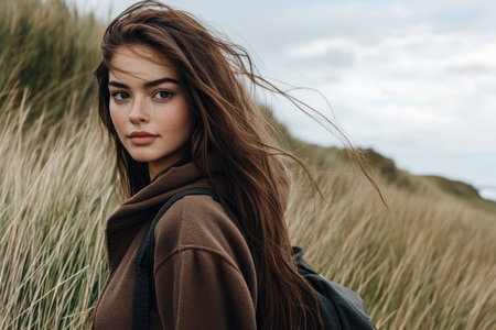 A beautiful woman with long hair stands in tall grass on the coast of New Zealand, wearing an oversized hoodie and backpack, close-up shot, natural lighting, high-resolution photography, detailed skin texture, portrait, in the style of Hasselblad X2D. --ar 3:2 --v 6.1 Job ID: db7cc218-965e-4c8b-8022-0a073f53c3a6