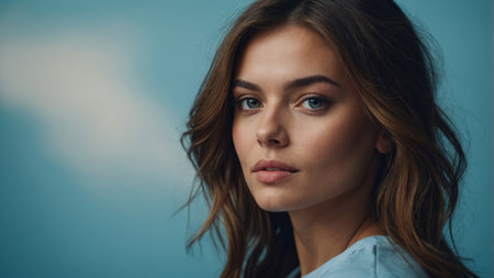 Portrait of a woman with flowing hair and striking blue eyes against a soft blue background in a serene indoor setting